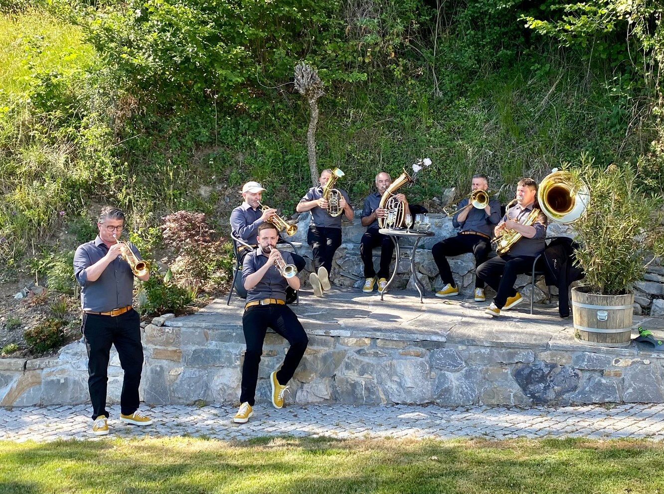 Eine lebhafte Guggenmusik, die für fröhliche Stimmung sorgt.